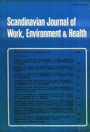 İÇİNDEKİLERExposure to xylene and ethylbenzene: I. Uptake, distribution and elimination in man by I. ASTRAND, J. ENGSTROM andp. OVRUM Exposure to xylene and ethylbenzene: II. Concentration in subcutaneous adipose tissue by J. ENGSTROM and R. BJUR-STROM Exposure to xylene and ethylbenzene: III. Effects on central nervous functions by F. GAMBERALE, G. ANNWALL and M. HULTENGREN Polycyclic aromatic hydrocarbdtis in the work atmosphere: I. Determination in an aluminum reduction plant by A. BJ0RSETH, O. BJ0RSETH and P. E. FJELDSTAD Polycyclic aromatic hydrocarbons in the work atmosphere: II. Determination in a coke plant by A. BJ0RSETH, O. BJ0RSETH and P. E. FJELDSTAD Exposure to toluene in a photogravure printing plant: Concen-tration in ambient air and uptake in the body by P. OVRUM, M. HULTENGREN and T. LINDQVIST A decrease in the prevalence and severity of vibration-induced white fingers among lumberjacks in Finland by I. PYYKKO, E. SAIRANEN, O. KORHONEN, M. FARKKILA and J. HYVARINEN Effect of occupational exposure to organophosphorus insecti-cides on neuromuscular function by E. STALBERG, P. HILTON-BROWN, B. KOLMODIN-HEDMAN, B. HOLMSTEDT and K.-B, AUGUSTINSSON Letter to the Editor: Dermatological and allergic hazards of cheesemakers by A. NIINIMAKI and S. SAARI Book review: Standards Setting ![]() |