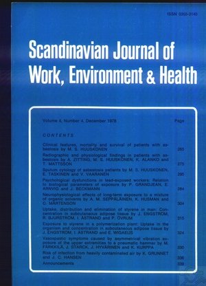 İÇİNDEKİLERCONTENTSClinical features, mortality and survival of patients with as-bestosis by M. S. HUUSKONEN Radiographic and physiological findings in patients with as-bestosis by A. ZITTING, M. S. HUUSKONEN, K. ALANKO and T. MATTSSON Sputum cytology of asbestosis patients by M. S. HUUSKONEN, E. TASKINEN and V. VAARANEN Psychological dysfunctions in lead-exposed workers: Relation to biological parameters of exposure by P. GRANDJEAN, E. ARNVIG and J. BECKMANN Neurophysiological effects of long-term exposure to a mixture of organic solvents by A. M. SEPPALAlNEN, K. HUSMAN and C. MARTENSON Uptake, distribution and elimination of styrene in man: Con-centration in subcutaneous adipose tissue by J. ENGSTRÖM, R. BJURSTRÖM, I. ASTRAND and P. ÖVRUM Exposure to styrene in a polymerization plant: Uptake in the organism and concentration in subcutaneous adipose tissue by J. ENGSTROM, I. ASTRAND and E. WIGAEUS Vasospastic symptoms caused by asymmetrical vibration exposure of the upper extremities to a pneumatic hammer by M. FARKKILA, J. STARCK, J. HYVARINEN and K. KURPPA Risk of infection from heavily contaminated air by K. GRUNNET and J. C. HANSEN Announcements ![]() |