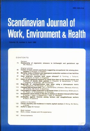 İÇİNDEKİLERCONTENTSReviews 73 Relationship of ergonomic stressors to birthweight and gestational age MC Marbury Original articles 85 Cluster of brain cancers spuriously suggesting occupational risk among glass-workers G Wingren, O Axelson 90 Mortality study of ethanol and isopropanol production workers at two facilities MJ Teta, GD Perlman, MG Ott 97 Does long-term concrete work cause silicosis? G Tornling, J Tollqvist, A Askergren, N Hallin, C Hogstedt 101 Effect of occupational exposure to cobalt blue dyes on the thyroid volume and function of female plate painters E Prescott, B Netterstrom, J Faber, L Hegedus, P Suadicani, JM Christensen 105 Magnitude of misclassification bias when using a job-exposure matrix TP Kauppinen, PO Mutanen, JT Seitsamo 113 Chelated lead and bone lead I Tell, LJ Somervaille, U Nilsson, I Bensryd, A Schutz, DR Chettle, MC Scott, S Skerfving 120 Carcinogens in rubber production in the Soviet Union LG Solionova, VB Smulevich, EV Turbin, LV Krivosheyeva, JV Plotnikov 124 Sympathetic nerve activity in the skin in relation to vibration-induced white finger G Ishida, Y Nasu, K Nakashima, T Sato, K Takahashi 128 Antibodies against Yersinia among farmers and slaughterhouse workers M Seuri, K Grantors Letters to the Editor 133 Cancer mortality and incidence in mastic asphalt workers O Wong, WJ Bailey, J Amsel 135 Author's reply ES Hansen Book reviews 142 Work, stress, disease and life expectancy 143 Announcements ![]() |