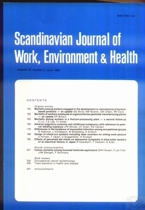İÇİNDEKİLERCONTENTSOriginal articles 145 Mortality among workers engaged in the development or manufacture off styrene- based products - an update GG Bond, KM Bodner, GW Olsen, RR Cook 155 Mortality of workers employed at organochlorine pesticide manufacturing plants - an update DP Brown 162 Mortality among workers in a thorium-processing plant - a second follow-up Z Liu, T-S Lee, TJ Kotek 169 Adverse pregnancy outcome and childhood malignancy with reference to pater-nal welding exposure JPE Bonde, JH Olsen, KS Hansen 178 Differences in the incidence of myocardial infarction among occupational groups N Hammar, L Alfredsson, M Smedberg, A Ahlbom 186 Design of check-out systems including laser scanners for sitting work posture U Hinnen, T Laubli, U Guggenbuhl, H Krueger 195 Effects of perceived job stress on depressive symptoms in blue-collar workers of an electrical factory in Japan N Kawakami, T Haratani, S Araki Shorter communications 201 Cancer mortality among licensed herbicide applicators GMH Swaen, C van Vliet, JJM Slangen, F Sturmans Book reviews 205 Occupational cancer epidemiology 205 Trace elements in health and disease 207 Announcements ![]() |
