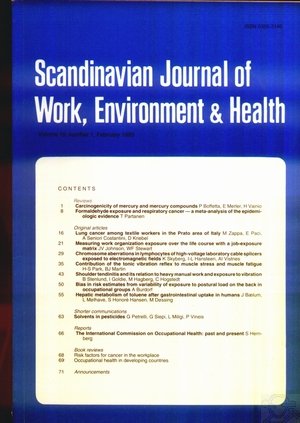 İÇİNDEKİLERCONTENTSReviews 1 Carcinogenicity of mercury and mercury compounds P Boffetta, E Merler, H Vainio 8 Formaldehyde exposure and respiratory cancer - a meta-analysis of the epidemi-ologic evidence T Partanen Original articles 16 Lung cancer among textile workers in the Prato area of Italy M Zappa, E Paci, A Senior! Costantini, D Kriebel 21 Measuring work organization exposure over the life course with a job-exposure matrix JV Johnson, WF Stewart 29 Chromosome aberrations in lymphocytes of high-voltage laboratory cable splicers exposed to electromagnetic fields K Skyberg, I-L Hansteen, Al Vistnes 35 Contribution of the tonic vibration reflex to muscle stress and muscle fatigue H-S Park, BJ Martin 43 Shoulder tendinitis and its relation to heavy manual work and exposure to vibration B Stenlund, I Goldie, M Hagberg, C Hogstedt 50 Bias in risk estimates from variability of exposure to postural load on the back in occupational groups A Burdorf 55 Hepatic metabolism of toluene after gastrointestinal uptake in humans J Baelum, L Molhave, S Honore Hansen, M Dossing Shorter communications 63 Solvents in pesticides G Petrelli, G Siepi, L Miligi, P Vineis Reports 66 The International Commission on Occupational Health: past and present S Hern-berg Book reviews 68 Risk factors for cancer in the workplace 69 Occupational health in developing countries 71 Announcements ![]() |