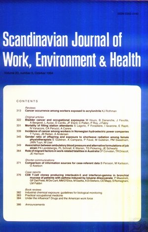 İÇİNDEKİLERCONTENTSReviews 313 Cancer occurrence among workers exposed to acrylonitrile KJ Rothman Original articles 322 Bladder cancer and occupational exposures M Hours, B Dananche, J Fevotte, A Bergeret, L Ayzac, E Cardis, JF Etard, C Fallen, P Roy, J Fabry 331 Mortality of filling station attendants S Lagorio, F Forastiere, I lavarone, E Rapiti, N Vanacore, CA Perucci, A Carere 339 Incidence of cancer among workers in Norwegian hydroelectric power companies T Tynes, JB Reitan, A Andersen 345 Gender ratio of offspring and exposure to shortwave radiation among female physiotherapists E Guberan A Campana, P Faval, M Guberan, PM Sweetnam, JWN Tuyn, M Usel 349 Association between ambulatory blood pressure and alternative formulations of job strain PA Landsbergis, PL Schnall, K Warren, TG Pickering, JE Schwartz 364 Role of migrant factors in work-related fatalities in Australia CF Corvalan, TR Driscoll, JE Harrison Shorter communications 371 Comparison of information sources for case-referent data B Persson, M Karlsson, O Axelson Case reports 376 CDS T-cell clones producing interleukin-5 and interferon-gamma in bronchial mucosa of patients with asthma induced by toluene diisocyanate P Maestrelli, GF Del Prete, M De Carli, MM D'Elios, M Saetta, A Di Stefano, CE Mapp, S Romagnani, LM Fabbri Book reviews 382 Industrial chemical exposure: guidelines for biological monitoring 383 Practical occupational medicine 384 Under the influence? Drugs and the American work force 386 Announcements ![]() |