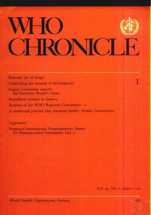 İÇİNDEKİLERRational use of drugs. Cooperation prevails at WHO ConferenceControlling the hazards of development. Are the developing countries ready?Morris Schaefer Expert Committee reports: the Executive Board's views Brucellosis summit in Geneva-G. G. Alton& M. Plommet Sessions of the WHO Regional Committees-2. A traditional practice that threatens health-female circumcision From the Regions South-East Asia: Bangladesh project helps to control neonatal tetanus Western Pacific: PEPAS promotes environmental health Notes and news Vector control series: information and training guides for middle-level health workerss-World Congress on Foodborne Infections and Intoxications, May 1986-Medical school update Recent WHO publications Supplement: Proposed International Nonproprietary Names for Pharmaceutical Substances: List 5 5 ![]() |