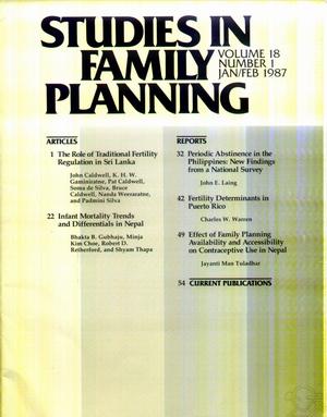İÇİNDEKİLERContents ARTICLES 1 The Role of Traditional Fertility Regulation in Sri Lanka John Caldwell, K. H. W. Gaminiratne, Pat Caldwell, Soma de Silva, Bruce Caldwell, Nanda Weeraratne, and Padmini Silva 22 Infant Mortality Trends and Differentials in Nepal Bhakta B. Gubhaju, Minja Kim Choe, Robert D. Retherford, and Shyam Thapa REPORTS 32 Periodic Abstinence in the Philippines: New Findings from a National Survey John E. Laing 42 Fertility Determinants in Puerto Rico Charles W. Warren 49 Effect of Family Planning Availability and Accessibility on Contraceptive Use in Nepal Jayanti Man Tuladhar 54 CURRENT PUBLICATIONS ![]() |