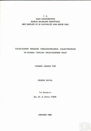 İÇİNDEKİLERİÇİNDEKİLERÖNSÖZ İÇİNDEKİLER GİRİŞ VE AMAÇ GENEL BİLGİLER B Ö L Ü M I SAKATLIK VE SAKATLAR ÜZERİNE GENEL BİLGİLER 1. BOZUKLUK, SAKATLIK VE ÖZÜR KAVRAMLARI 2. SAKATLIK ÇEŞİTLERİ 3. ÜLKEMİZDE SAKAT SAYISI VE DAĞILIMLARI 3.1. Sakatlık Nedenleri üzerine Bir Araştırma 3.2. Sakatlık ve Sebep Olduğu Çalışma Gücünden Kayıp Oranları 4. DÜNYADA SAKATLAR 5. SAKATLIK OLGUSU VE İNSAN 6. TOPLUMUMUZ VE SAKATLAR 7. SAKATLARIN YASAL HAKLARI BÖLÜM II ÖZÜRLÜLERİN MESLEKİ REHABİLİTASYONU 1. MESLEKİ REHABİLİTASYONUN TANIMLARI 2. ÖZÜRLÜLERE YÖNELİK MESLEKİ REHABİLİTASYON PROGRAMLARININ BAŞLATILMASI ÖZÜRLÜLERİN MESLEKÎ REHABİLİTASYONU VE ÜLKEMİZDE DURUM BÖLÜM III ÖZÜRLÜLERİN İSTİHDAMI 1. ÖZÜRLÜLERİN İSTİHDAMINA GENEL BAKIŞ 1.1. Özürlülerin İstihdamında Ana Sorunlar 2. EKONOMİDE İŞSİZLİK ORANI 3. ÖZÜRLÜLERİN İSTİHDAMI KONUSUNDA ÇEŞİTLİ ÜLKELERDE YAPILAN ÇALIŞMALAR 4. İŞVERENLERİN ÖZÜRLÜ ÇALIŞTIRILMASINA BAKIŞ AÇISI 5. ÖZÜRLÜLERİN İSTİHDAMI İÇİN TEŞVİK UNSURLARI BÖLÜM IV ÖZÜRLÜLERİN ÇALIŞTIRILMASINA KAMUOYU YAKLAŞIMI VE TOPLUM ÖRGÜTLERİ 1. ÖZÜRLÜLERİN ÇALIŞTIRILMASINDA KAMUOYU YAKLAŞIMI 2. TOPLUM ÖRGÜTLERİ 3. SENDİKALARIN ÖZÜRLÜLERİN ÇALIŞMASINA YAKLAŞIMI 4 . KORUMALI İŞYERLERİ MATERYAL VE YÖNTEM 1. Literatür Taramasi 2. Anket Sorularının Hazırlanması 2. Araştırmanın Değerlendirilmesi BULGULAR I. SAKATLARLA iLGİLİ ÖRGÜTLER II. ANKETE KATILAN KURULUŞLAR HAKKINDA GENEL BİLGİLER 1. KURULUŞ YILLARI KURULUŞ AMAÇLARI 3. ÜYE SAYISI 4. KURULUŞLARDA ÇALIŞAN SAYISI, ÇALIŞANLARIN EĞİTlM DURUMU 5. KURULUŞLARA ÜYE KAYDI 6. GELiR KAYNAKLARI, GELiRLERi VE SÜREKLi GELiR GETIRlLERl 7. HiZMET VERİLEN YER HAKKINDA BiLGiLER 8. KURULUŞLARIN YAYINLARI HAKKINDA BiLGiLER III. KURULUŞLARIN VERDİKLERİ HiZMETLER HAKKINDA BiLGiLER 1. KURULUŞLARIN VERDİKLERİ HiZMETLER 2. HiZMET VERÎRKEN KARŞILAŞILAN GÜÇLÜKLER 3. HİZMETLERİN GELlŞTlRlLMESl İçİN YAPILMASI GEREKEN KATKILAR 4. GÖNÜLLÜ KATILIMI VE ÇALIŞMALARI IV. ÖZÜRLÜLERiN MESLEKi EĞiTiMi VE İSTİHDAMI İLE iLGiLi BiLGiLER 1. KURULUŞLARDA MESLEKi EĞiTiM VERlLİP VERİLMEDİĞİ HAKKINDA BiLGiLER 2. KURULUŞLARIN İş BULMA KONUSUNDA ÇALIŞMALARI 3. ÖZÜRLÜLERiN MESLEKi EĞiTİMi VE İş BULMASI KONUSUNDA ETKiN OLABiLMESi IçlN BU KURULUŞLARIN BEKLEDiĞİ KATKILAR 4. ÖZÜRLÜLERiN MESLEKi EĞiTiMi VE İş BULMASI KONUSUNDA ETKiN OLABiLMESi İÇİN BU KURULUŞLARIN BEKLEDiĞi KATKILAR TARTIŞMA VE SONUÇ Ö Z E T YABANCI DİLDE ÖZET EKLER Sakatlık ve Sebep Oldukları Çalışma Gücünden Kayıp Oranları Anket Soruları KAYNAKLAR ÖZGEÇMiŞ NOTLARGazi Üniversitesi Sağlık Blimleri Enstitüsü İşçi Sağlığı ve İş Güvenliği Ana Bilim Dalı Yüksek Lisans Tezi ![]() |