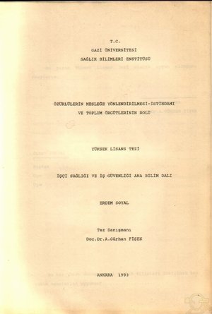 İÇİNDEKİLERİÇİNDEKİLERÖNSÖZ İÇİNDEKİLER GİRİŞ VE AMAÇ GENEL BİLGİLER B Ö L Ü M SAKATLIK VE SAKATLAR ÜZERİNE GENEL BİLGİLER 1. BOZUKLUK, SAKATLIK VE ÖZÜR KAVRAMLARI 2. SAKATLIK ÇEŞİTLERİ 3. ÜLKEMİZDE SAKAT SAYISI VE DAĞILIMLARI 3.1. Sakatlık Nedenleri üzerine Bir Araştırma 3.2. Sakatlık ve Sebep Olduğu Çalışma Gücünden Kayıp Oranları 4. DÜNYADA SAKATLAR 5. SAKATLIK OLGUSU VE İNSAN 6. TOPLUMUMUZ VE SAKATLAR 7. SAKATLARIN YASAL HAKLARI B Ö L Ü M II ÖZÜRLÜLERİN MESLEKİ REHABİLİTASYONU 1. MESLEKİ REHABİLİTASYONUN TANIMLARI 2. ÖZÜRLÜLERE YÖNELİK MESLEKİ REHABİLİTASYON PROGRAMLARININ BAŞLATILMASI ÖZÜRLÜLERİN MESLEKİ REHABİLİTASYONU VE ÜLKEMİZDE DURUM BÖLÜM III ÖZÜRLÜLERİN İSTİHDAMI 1. ÖZÜRLÜLERİN İSTİHDAMINA GENEL BAKIŞ 1.1. Özürlülerin İstihdamında Ana Sorunlar 2. EKONOMİDE İŞSİZLİK ORANI 3. ÖZÜRLÜLERİN İSTİHDAMI KONUSUNDA ÇEŞİTLİ ÜLKELERDE YAPILAN ÇALIŞMALAR 4. İŞVERENLERİN ÖZÜRLÜ ÇALIŞTIRILMASINA BAKIŞ AÇISI 5. ÖZÜRLÜLERİN İSTİHDAMI İÇİN TEŞVİK UNSURLARI BÖLÜM IV ÖZÜRLÜLERİN ÇALIŞTIRILMASINA KAMUOYU YAKLAŞIMI VE TOPLUM ÖRGÜTLERİ 1. ÖZÜRLÜLERİN ÇALIŞTIRILMASINDA KAMUOYU YAKLAŞIMI 2. TOPLUM ÖRGÜTLERİ 3. SENDİKALARIN ÖZÜRLÜLERİN ÇALIŞMASINA YAKLAŞIMI 4 . KORUMALI İŞYERLERİ MATERYAL VE YÖNTEM 1. Literatür Taraması 2. Anket Sorularının Hazırlanması 3. Araştırmanın Değerlendirilmesi BULGULAR 1. SAKATLARLA İLGİLİ ÖRGÜTLER II. ANKETE KATILAN KURULUŞLAR HAKKINDA GENEL BİLGİLER 1. KURULUŞ YILLARI KURULUŞ AMAÇLARI 3. ÜYE SAYISI 4. KURULUŞLARDA ÇALIŞAN SAYISI, ÇALIŞANLARIN EĞÎTİM DURUMU 5. KURULUŞLARA ÜYE KAYDI 6. GELİR KAYNAKLARI, GELIRLERÎ VE SÜREKLİ GELİR GETİRİLERİ 7, HİZMET VERİLEN YER HAKKINDA BİLGİLER 8. KURULUŞLARIN YAYINLARI HAKKINDA BİLGİLER III. KURULUŞLARIN VERDİKLERİ HİZMETLER HAKKINDA BİLGİLER 1. KURULUŞLARIN VERDİKLERİ HİZMETLER 2. HİZMET VERİRKEN KARŞILAŞILAN GÜÇLÜKLER 3. HİZMETLERİN GELİŞTİRİLMESİ İÇİN YAPILMASI GEREKEN KATKILAR 4. GÖNÜLLÜ KATILIMI VE ÇALIŞMALARI IV, ÖZÜRLÜLERİN MESLEKİ EĞİTİMİ VE İSTİHDAMI İLE İLGİLİ BİLGİLER 1. KURULUŞLARDA MESLEKİ EĞİTİM VERİLİP VERİLMEDİĞİ HAKKINDA BİLGİLER 2. KURULUŞLARIN İŞ BULMA KONUSUNDA ÇALIŞMALARI 3. ÖZÜRLÜLERİN MESLEKİ EĞİTİMİ VE İŞ BULMASI KONUSUNDA ETKİN OLABİLMESİ İÇİN BU KURULUŞLARIN BEKLEDİĞİ KATKILAR 4. ÖZÜRLÜLERİN MESLEKİ EĞİTİMİ VE İŞ BULMASI KONUSUNDA ETKİN OLABİLMESİ İÇİN BU KURULUŞLARIN BEKLEDİĞİ KATKILAR TARTIŞMA VE SONUÇ Ö Z E T YABANCI DİLDE ÖZET EKLER Sakatlık ve Sebep Oldukları Çalışma Gücünden Kayıp Oranları Anket Soruları KAYNAKLAR ÖZGEÇMİŞ NOTLARGazi Üniversitesi Sağlık Bilimleri Enstitüsü İşçi Sağlığı ve İş Güvenliği Ana Bilim Dalı Yüksek Lisans Tezi ![]() |