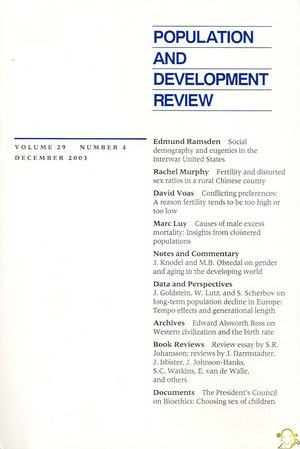 İÇİNDEKİLERARTICLESSocial Demography and Eugenics in the Interwar United States EDMUND RAMSDEN Fertility and Distorted Sex Ratios in a Rural Chinese County: Culture, State, and Policy RACHEL MURPHY Conflicting Preferences: A Reason Fertility Tends to Be Too High or Too Low DAVID VOAS Causes of Male Excess Mortality: Insights from Cloistered Populations MARC LUY NOTES AND COMMENTARY Gender and Aging in the Developing World: Where Are the Men? JOHN KNODEL MARY BETH OFSTEDAL DATA AND PERSPECTIVES Long-Term Population Decline in Europe: The Relative Importance of Tempo Effects and Generational Length JOSHUA GOLDSTEIN WOLFGANG LUTZ SERGEI SCHERBOV ARCHIVES Edward Alsworth Ross on Western Civilization and the Birth Rate BOOK REVIEWS When Numbers Began to Count for Health Policy: A Review Essay on Andrea A. Rusnock, Vital Accounts: Quantifying Health and Population in Eighteenth-Century England and France SHEILA RYAN JOHANSSON Jack M. Hollander, The Real Environmental Crisis: Why Poverty, Not Affluence, Is the Environment's Number One Enemy JOEL DARMSTADTER Glenn Firebaugh, The New Geography of Global Income Inequality JOHN ISBISTER Nancy E. Riley and James McCarthy, Demography in the Age of the Postmodern JENNIFER JOHNSON-HANKS Catherine Campbell, 'Letting Them Die': Why HIV/AIDS Prevention Programmes Fail SUSAN COTTS WATKINS Konstantinos Kapparis, Abortion in the Ancient World ETIENNE VAN DE WALLE Short Reviews DOCUMENTS The President's Council on Bioethics: Choosing Sex of Children ABSTRACTS AUTHORS FOR THIS ISSUE CONTENTS TO VOLUME 29 ![]() |
