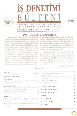 İÇİNDEKİLERİÇİNDEKİLER BAŞYAZI . Kamu Yönetimi Yapılandırılıyor Kapak YÖNETİM KURULUNDAN İŞ DENETİMİ . Dünyada ve Ülkemizde Kamu Yönetiminde Reform ve İş Denetimine Yansımaları: 1990'lardan 2000'lere ÇALIŞMA YAŞAMI . İşçilerin Hak Arama Sürecinde Bilgi Düzeyi, Örgütsel Yapı ve Yasal Uygulamalar Hakkındaki Tutumları Araştırması . Kadın Haklan ve Çalışma Yaşamında Kadın . Kazanlarda Basınç Testi............................................................................... ....................................................16 MEVZUAT . Avrupa Birliği Müktesebatının Üstlenilmesine İlişkin Türkiye Ulusal Programının Uygulanması Koordinasyonu ve İzlenebilmesine Dair Karar .....................................................................................................................................................................17 . 2821 Sayılı Sendikalar Kanunu'nun Bazı Maddelerinin Değiştirilmesine İlişkin Yasa Taslağı.....................................................................................................................................................................20 . 2822 Sayılı Toplu İş Sözleşmesi Grev ve Lokavt Kanunu'nun Bazı Maddelerinin Değiştirilmesine İlişkin Yasa Taslağı............................................................. . 4857 Sayılı İş Kanunu.......................................................................................................................................... . 4857 Sayılı Yeni İş Kanunu İle Getirilen İşyeri Tanımı Ev Eksenli Çalışanları Kapsıyor mu?.................................................................... ............................................................................................ . Ekonomik Kriz ve Kısa Çalışma............................................................................................................... . İşverenin İşçi Bildirim Yükümlülüğü.................................................................................................. . Kamuda Denetim....................................................................................................................................................... YARGITAY KARARLARI BAKANLIKTAN HABERLER BASINDAN KESİTLER KISA KISA YENİ YAYINLAR SANAT VE YAŞAM VERİ - VERİ ![]() |
