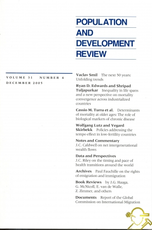 İÇİNDEKİLERARTICLESThe Next 50 Years: Unfolding Trends Vaclav Smil Inequality in Life Spans and a New Perspective on Mortality Convergence Across Industrialized Countries RyanD. Edwards Shripad Tuljapurkar Determinants of Mortality at Older Ages: The Role of Biological Markers of Chronic Disease Cassio M. Turra Noreen Goldman Christopher L. Seplaki Dana A. Glei Yu-Hsuan Lin Maxine Weinstein Policies Addressing the Tempo Effect in Low-Fertility Countries Wolfgang Lutz Vegard Skirbekk NOTES AND COMMENTARY On Net Intergenerational Wealth Flows: An Update John C. Caldwell DATA AND PERSPECTIVES The Timing and Pace of Health Transitions around the World JAMES C. RlLEY ARCHIVES Paul Fauchille on the Rights of Emigration and Immigration BOOK REVIEWS National Research Council and Institute of Medicine, Panel on Transitions to Adulthood in Developing Countries, Cynthia B. Lloyd (ed.), Growing Up Global: The Changing Transitions to Adulthood in Developing Countries John G. Haaga Gordon H. Sellon, Jr. (ed.), Global Demographic Change: Economic Impacts and Policy Challenges; A Symposium Sponsored by the Federal Reserve Bank of Kansas City, Jackson Hole, Wyoming, August 26-28,2004 Geoffrey McNicoll Herwig Birg, Die ausgefallene Generation: Was die Demographie tiber unsere Zukunft sagt (The generation that dropped out: What demography says about our future) ETIENNE VAN DE WALLE Roger Mark Selya, Development and Demographic Change in Taiwan 1945-1995 Zachary Zimmer Short Reviews Majid Ezzati, Alan D. Lopez, Anthony Rodgers, and Christopher J. L. Murray (eds.), Comparative Quantification of Health Risks: Global and Regional Burden of Disease Attributable to Selected Major Risk Factors Terence H. Hull (ed.), People, Population, and Policy in Indonesia Gavin W. Jones and Mehtab S. Karim (eds.), Islam, the State and Population Policy Sarah Michael, Undermining Development: The Absence of Power among Local NGOs in Africa Lisa Smyth, Abortion and Nation: The Politics of Reproduction in Contemporary Ireland United Nations Economic Commission for Europe and United Nations Population Fund, The New Demographic Regime: Population Challenges and Policy Responses Klaus F. Zimmermann (ed.), European Migration: What Do We Know? DOCUMENTS Report of the Global Commission on International Migration ABSTRACTS AUTHORS FOR THIS ISSUE CONTENTS TO VOLUME 31 ![]() |
