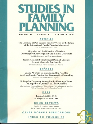 İÇİNDEKİLERSTUDIES INFAMILY PLANNING VOLUME 36 NUMBER 4 DECEMBER 2005 ARTICLES The Dilemma of Past Success: Insiders' Views on the Future of the International Family Planning Movement Ann K. Blanc and Amy O. Tsui Migration and the Diffusion of Modern Contraceptive Knowledge and Use in Rural Guatemala David P. Lindstrom and Elisa Munoz-Franco Factors Associated with Spousal Physical Violence Against Women in Bangladesh Ruchira Tabassum Naved and Lars Ake Persson REPORTS Unsafe Abortion in Tanzania and the Need for Involving Men in Postabortion Contraceptive Counseling / Vibeke Rasch and Mathias A. Lyaruu Ruling Out Pregnancy Among Family Planning Clients: The Impact of a Checklist in Three Countries John Stanback, Fatimata Diabate, Thierno Dieng, Telma Duarte de Morales, Stirling Cummings, and Mahamodou Traore DATA Bangladesh 2004: Results from the Demographic and Health Survey Madagascar 2003-04: Results from the Demographic and Health Survey BOOK REVIEWS World Youth Report 2003: The Global Situation of Young People by United Nations Cynthia B. Lloyd Female Infanticide in India: A Feminist Cultural History by Rashmi Dube Bhatnagar, Renu Dube, and Reena Dube Leela Visaria OTHER NOTABLE PUBLICATIONS INDEX TO VOLUME 36 NOTLARYayın bir derleme çalışması olduğu için,yazar ismi olarak editör ismi verilmiştir. ![]() |