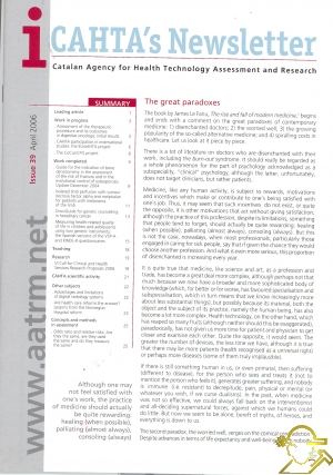 İÇİNDEKİLERWork in progress. Assessment of the therapeutic procedure and its outcomes in digestive oncology: initial results . CAHTA participation in international studies: the EUnetHTA project . The CoCanCPG project Work completed . Guide for the indication of bone densitometry in the assessment of the risk of fracture and in the evolutional control of osteoporosis. Update December 2004 . Isolated limb perfusion with tumour necrosis factor alpha and melphalan for patients with melanoma of the limb . OncoGuide for genetic counselling in hereditary cancer . Measuring health-related quality of life in children and adolescents using two generic instruments: the Spanish versions of the VSP-A and KINDL-R questionnaires Teaching Research .VI Call for Clinical and Health Services Research Proposals 2006 CAHTA scientific activity Other subjects . Advantages and limitations of digital radiology systems . Are health care reforms the answer? Lessons from the Norwegian Hospital reform Concepts and methods in assessment . Odds ratio and relative risks: Are they the same, are they used the same and do they measure the same? ![]() |