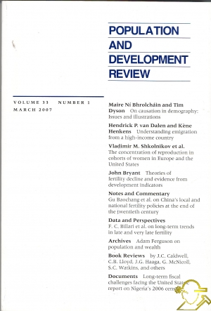 İÇİNDEKİLERARTICLESOn Causation in Demography: Issues and Illustrations MAlRE Nf BHROLCHAIN Tim Dyson Longing for the Good Life: Understanding Emigration from a High-Income Country HENDRJK P. VAN" DALBN KENB HENKENS The Concentration of Reproduction in Cohorts of Women in Europe and the United States VLADIMIR M. SHKOLNIKOV EVGUBNIM. ANDREEV RENE HOULE Jambs W. Vaupel Theories of Fertility Decline and the Evidence from Development Indicators JOHN BRYANT NOTES AND COMMENTARY China's Local and National Fertility PoJicies at the End of the Twentieth Century gubaochang Wang Feng guo zhigang zhang hrli DATA AND PERSPECTIVES Approaching the Limit: Long-Term Trends in Late and Very Late Fertility Francesco C. billari Hans-peter Rohler gunnak antjersson Hans lundstrom ARCHIVES Adam Ferguson on Population and Wealth BOOK John F, Kantner and Andrew Kantner, The Struggle for International Consensus on Population and Development JOHN C. CALDWELL World Bank, World Development Report 2007: Development and the Next Generation CYNTHIA B. LLOYD Lyla M. Hernandez and Dan G. Biazer (eds.), Genes, Behavior, and the Social Environment: Moving Beyond the Nature/Nurture Debate John G. Haaga World Bank, Global Economic Prospects 2007: Managing the Next Wave of Globalization GHOFFREY MCNlCOLL Daniel Jordan Smith, A Culture of Corruption: Everyday Deception and Popular Discontent in Nigeria Susan Cotts watkins Short Reviews IanBamion and Maria C. Correia (eds.), The Other Half of Gender: Men's Issues in Development John Broome, Weighing Lives Food and Agriculture Organization of the United Nations, The State of Food and Agriculture: Agricultural Trade and Poverty: Can Trade Work for the Poor? John Glad, Future Human Evolution: Eugenics in the Twenty-First Century United Nations Development Programme, Human Development Report 2006. Beyond Scarcity: Power, Poverty and the Global Water Crisis DOCUMENTS Ben S. Bernanke on Long-Term Fiscal Challenges Facing the United States Report of Nigeria's National Population Commission on the 2006 Census ABSTRACTS AUTHORS FOR THIS ISSUE ![]() |