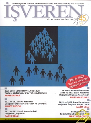 • ZOOM "2821 Sayılı Sendikalar ve 2822 Sayılı Toplu İş Sözleşmesi, Grev ve Lokavt Kanunu" AGAH KAFKAS ÇORUM MİLLETVEKİLİ, TBMM SAĞLIK, AİLE, ÇALIŞMA VE SOSYAL İŞLER KOMİSYONU BAŞKAN VEKİLİ, AK PARTİ TEŞKİLAT BAŞKAN YARDIMCISI 29• ZOOM "2821 ve 2822 Sayılı Yasalarda Değişiklik Öngören Yasa Teklifi Ne Getiriyor?" AHMET ERDEM ÇALIŞMA VE SOSYAL GÜVENLİK BAKANLIĞI MÜSTEŞARI 32• ZOOM "2821 ve 2822 Sayılı Kanunlardaki Değişiklik Çalışmaları" SADİK OĞUZ TİSK YÖNETİM KURULU VE YÜRÜTME KOMİTESİ BAŞKAN VEKİLİ 35 ZOOM "TBMM Gündeminde Bulunan 2821 ve 2822 Sayılı Yasalarda Değişiklik Öngören Yasa Teklifi" MUSTAFA KUMLU TÜRK-İŞ GENEL BAŞKANI 37 ZOOM "2821 ve 2822 Sayılı Kanunlarda Değişiklik Öngören Kanun Teklifi" SALİM USLU HAK-İŞ KONFEDERASYONU GENEL BAŞKANI 39 ZOOM "Sendikal Yasalarda 12 Eylül Hukuku Devam Ediyor" SÜLEYMAN ÇELEBİ DİSK GENEL BAŞKANI 41 • ZOOM "2821 ve 2822 Sayılı Yasa Tasarılarının Değerlendirilmesi" HASİP KURT ARÇEÜK A.Ş. ENDÜSTRİYEL İLİŞKİLER YÖNETİCİSİ 43 * ZOOM "ILO ve AB Normları Açısından 2821 ve 2822 Sayılı Kanunlar" PROF. DR. TOKER DERELİ IŞIK ÜNİVERSİTESİ ÖĞRETİM ÜYESİ 45 KADINLAR VE GENÇLER 47 İNSAN DİYE DİYE "Oryantasyon Programınız Amacına Ulaşıyor Mu?" DR. SEMA ÖZÇER MAY DANIŞMANLIK-KURUCU ORTAK 48 • SÖYLEŞİ "Kaçakçılık Ülkemizin En Önemli Sorun Alanlarından Biridir" M. EMİN ZARARSIZ T.C. BAŞBAKANLIK GÜMRÜK MÜSTEŞARI 50 SÖYLEŞİ "Tarihsiz Bir Toplum Belleksiz Bir Adam Gibi Olur" TURGUT ÖZAKMAN_58 • SANAT "Çocukları Kukla Tiyatrosuyla Buluşturuyor" ULVİYE KARACA 64 YAZI DİZİSİ:MADEN "Türkiye'de Metalik Maden Potansiyeli" 68 • İNCELEME "Türkiye-AB Müzakerelerinde Son Durum" DR. CENGİZ AKTAR BAHÇEŞEHİR ÜNİVERSİTESİ AB MERKEZİ BAŞKANI "72 • GÖRÜŞ "İş Sağlığı ve Güvenliği Mevzuatında Güncel Gelişmeler" 76 ARAŞTIRMA "Gençler: Eğitimsiz, İşsiz ve Atıl" ESRA BELEN TİSK ARAŞTIRMA, EĞİTİM VE DIŞ İLİŞKİLER UZMANI 80 *TİSK HABERLER 83 • ARKEOGEZİ "Metropdis Antik Kenti" 91 •TARİHTE BU AY 94• AVRUPA AVRUPA 96 • İSTATİSTİK 98 *YENİ YAYINLAR 100