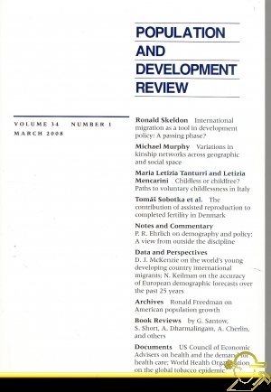 İÇİNDEKİLERARTICLESInternational Migration as a Tool in Development Policy: 1 A Passing Phase? RONALD SKELDON Variations in Kinship Networks Across Geographic and Social Space 19 Michael Murphy Childless or Childfree? Paths to Voluntary Childlessness in Italy 51 MARIA LETIZIA TANTURRI LETIZIA MENCARINI The Contribution of Assisted Reproduction to Completed Fertility: An Analysis of Danish Data 79 tomas sobotka, martin a. hansen, tina kold jensen, anette t0nnes pedersen, Wolfgang Lutz, Niels Erik Skakkeb^ek NOTES AND COMMENTARY Demography and Policy: A View from Outside the Discipline 103 PAUL R. EHRLICH DATA AND PERSPECTIVES A Profile of the World's Young Developing Country International Migrants 115 DAVID J. MCKENZIB European Demographic Forecasts Have Not Become More Accurate Over the Past 25 Years 137 NICO KEILMAN ARCHIVES Ronald Freedman on American Population Growth: A View from 1957 155 BOOK REVIEWS Warren C. Robinson and John A. Ross (eds.), The Global Family Planning Revolution: Three Decades of Population Policies and Programs GIGI SANTOW 169 Zhongwei Zhao and Fei Guo (eds.), Transition and Challenge: China's Population at the Beginning of the 21st Century Susan short Goran Therborn, Between Sex and Power: Family in the World, 1900-2000 A. DHARMALINGAM David Blankenhorn, The Future of Marriage Andrew Cherlin 175 Short Reviews 178 Duane F. Alwin, Margins of Error: A Study of Reliability in Survey Measurement John Creedy and Ross Guest (eds.), New Developments in the Economics of Population Ageing Susan Markens, Surrogate Motherhood and the Politics of Reproduction Libby Schweber, Disciplining Statistics: Demography and Vital Statistics in France and England, 1830-1885 Arlette Campbell White, Thomas W. Merrick, and Abdo S. Yazbeck, Reproductive Health—The Missing Millennium Development Goal: Poverty, Health, and Development in a Changing World Xiang Biao, Transcending Boundaries: Zhejiangcun: The Story of a Migrant Village in Beijing DOCUMENTS The US Council of Economic Advisers on Health and the Demand for Health Care 183 The World Health Organization on the Global Tobacco Epidemic 188 ABSTRACTS 195 AUTHORS FOR THIS ISSUE 198 ![]() |