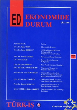 İÇİNDEKİLERYönetim KuruluSunuş................................5 Prof. Dr. Oğuz OYAN Ekonomide Durum................7 Prof. Dr. Taner BERKSOY 1996'da Ekonomik Sorun: İstikrarsızlık ve Dizginlenemeyen Büyüme..............19 Prof. Dr. İzzettin ÖNDER Yıl Sonuna Doğru Ekonomi...............28 Dr. Özün AKGÜÇ Para ve Kredi Alanında Gelişmeler.................35 Doç. Dr. Erinç YELDAN Kısa Vadeli Sermaye Akımları.........................41 Prof. Dr. Haluk KASNAKOĞLU Türkiye'de Ücretler ve Fiyatlar: 1960-1995.............49 Yrd. Doç. Dr. Aziz KONUKMAN Türkiye Ekonomisindeki Ücret-Fiyat İlişkileri, Sektörel Fiyat Oluşumu ve Enflasyon....................59 Doç. Dr. Nurhan YENTÜRK Türkiye'de Düşük Ücretler Yatırımları Teşvik Ediyor mu?....67 Prof. Dr. Tuncer BULUTAY Türkiye'de İşlendirme ve İşsizlik- Genel Eğilimler........76 Aykut GÖKER ve Tülay AKARSOY Türkiye'nin Bilim ve Teknoloji Politikası.................84 Prof. Dr. Oğuz OYAN Ekonomik Göstergeler....................97 NOTLARGüz 1996 ![]() |