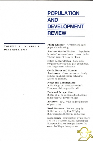 İÇİNDEKİLERAristotle and Open Population Thinking/ PHILIP KREAGER"Population Invasion" versus Urban Exclusion in the Tibetan Areas of Western China Andrew Martin Fischer Food Price Surges: Possible Causes, Past Experience, and Longer Term Relevance NIKOS ALEXANDRATOS Consequences of Family Policies on Childbearing Behavior: Effects or Artifacts? GERDA NEYER GUNNAR ANDERSSON NOTES AND COMMENTARY "Demodystopias": Prospects of Demographic Hell ANDREU DOMINGO DATA AND PERSPECTIVES Continued Reductions in Mortality at Advanced Ages ROLAND RAU EUGENY SOROKO DOMANTAS JASIL1ONIS JAMES W. VAUPEL ARCHIVES H. G. Wells on the Diffusion of Great Cities BOOK REVIEWS Low-Cost Routes to Good Health: A Review Essay on James C. Riley, Low Income, Social Growth, and Good Health KENNETH HILL Gregory Clark, A Farewell to Alms: A Brief Economic History of the World E. A. WRIGLEY Tomas Frejka, Jan M. Hoem, Tomas Sobotka, and Laurent Toulemon (eds.), Childbearing Trends and Policies in Europe (Special Collection 7, Demographic Research) RON LESTHAEGHE Susan Greenhalgh, Just One Child: Science and Policy in Deng's China DELIA DAVIN Short Reviews Sylvia Chant, Gender, Generation and Poverty: Exploring the 'Feminisation of Poverty' in Africa, Asia and Latin America Florian Coulmas, Harald Conrad, Annette Schad-Seifert, and Gabriele Vogt (eds.), The Demographic Challenge: A Handbook about Japan Richard Jackson and Neil Howe, The Graying of the Great Powers: Demography and Geopolitics in the 21st Century Pew Research Center, Muslim Americans: Middle Class and Mostly Mainstream Population Bulletin of the United Nations, Prospects for Fertility Decline in High Fertility Countries United Kingdom Parliament, House of Lords Select Committee on Economic Affairs, The Economic Impact of Immigration Sheldon X. Zhang, Chinese Human Smuggling Organizations: Families, Social Networks, and Cultural Imperatives DOCUMENTS Immigration Assumptions in Projecting the US Social Security Burden The European Pact on Immigration on the Control of Illegal Immigration ABSTRACTS AUTHORS FOR THIS ISSUE CONTENTS TO VOLUME 34 ACKNOWLEDGMENTS ![]() |