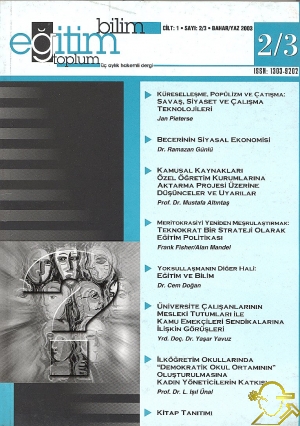 İÇİNDEKİLERKÜRESELLEŞME, POPÜLİZM VE ÇATIŞMA!Savaş, Siyaset ve Çalışma Teknolojileri Jan Pieterse Becerinin Siyasal Ekonomisi Dr. Ramazan Günlü Kamusal Kaynakları özel öğretim kurumlarına Aktarma Projesi Üzerine düşünceler ve uyarılar Prof. Dr. Mustafa Altıntaş Meritokrasiyi yeniden Meşrulaştırmak: Teknokrat bir Strateji Olarak Eğitim Politikası Frank Fisher/Alan Mandel Yoksullaşmanın Diğer Hali:EĞİTİM VE BİLİM Dr. Cem Doğan Üniversite Çalışanlarının Mesleki Tutumları ile Kamu Emekçileri Sendikalarına ilişkin görüşleri Yrd. Doç. Dr. Yaşar Yavuz ilköğretim okullarında"demokratik okul ortamının" Oluşturulmasına Kadın Yöneticilerin Katkısı Prof. Dr. L. Işıl Ünal ![]() |