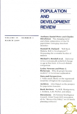 İÇİNDEKİLERThe Changing Racial and Ethnic Composition of the US Population: Emerging American IdentitiesAnthony Daniel Perez charles hirschman "Roll Back Malaria, Roll in Development"? Reassessing the Economic Burden of Malaria RANDALL M. PACKARD Universal versus Economically Polarized Change in Age at First Birth: A French-British Comparison MICHAEL S. REND ALL OLIVIA EKTiRT-jAFFE HEATHER JOSHI KEVIN LYNCH REMI MOUGIN Why Do People Become Modern? A Darwinian Explanation Lesley Newson Peter j. Richerson DATA AND PERSPECTIVES The Segmented Trend Line of Highest Life Expectancies jacques vallin France Mesle ARCHIVES John Hajnal on the Prospect for Population Forecasts BOOK REVIEWS World Bank, World Development Report 2009: Reshaping Economic Geography MARK R. MONTGOMERY Barry Cunliffe, Europe between the Oceans—9000 BC-AD 1000 JESPER BOLDSEN Geoff Childs, Tibetan Transitions: Historical and Contemporary Perspectives on Fertility, Family Planning, and Demographic Change Andrew m. Fischer Short Reviews Juha M. Alho, Svend E. Hougaard Jensen, and Jukka Lassila (eds.), Uncertain Demographics and Fiscal Sustainability Simone M. Caron, Who Chooses? American Reproductive History Since 1830 Ian Dowbiggin, The Sterilization Movement and Global Fertility in the Twentieth Century Duncan Green, From Poverty to Power: How Active Citizens and Effective States Can Change the World World Health Organization, World Malaria Report 2008 DOCUMENTS The US National Intelligence Council's Global Trends 2025 Revocation of the Reinstatement of the "Mexico City Policy" on US Family Planning Assistance ABSTRACTS AUTHORS FOR THIS ISSUE ![]() |