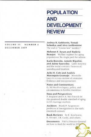 İÇİNDEKİLERARTICLESThe End of "Lowest-Low" Fertility? joshua r. goldsteın tomâs sobotka aıva jasılıonıene Welfare Regimes for Aging Populations: No Single Path for Reform Mehmet F. aysan Roderic Beaujot Latin America and the Social Contract: Patterns of Social Spending and Taxation Karla breceda jamele rıgolını jaıme Saavedra Homicide Rates in a Cross-Section of Countries: Evidence and Interpretations julıo H. cole Andres Marroquîn Gramajo NOTES AND COMMENTARY Legacy, Policy, and Circumstance in Fertility Transition Geoffrey McNicoll DATA AND PERSPECTIVES The Gendered Double Standard of Aging in US Marriage Markets Paula England Elizabeth Aura McClintock ARCHIVES Frank P. Sargent on Problems of Immigration in the Early Tvventieth Century BOOK REVIEWS Christopher Caldvvell, Reflections on the Revolution in Europe: Immigration, islam, and the West Eric Kaufmann Andrew J. Cherlin, The Marriage-Go-Round: The State of Marriage and the Family in America Today Edward Shorter David-Boyd Haycock, Mortal Coil: A Short History ofLiving Longer James R. Carey Short Revievvs Daryl Collins, Jonathan Morduch, Stuart Rutherford, and Orlanda Ruthven, Portfolios of the Poor: How the World's Poor Live on $2 a day Susan A. Crate and Mark Nuttall (eds.), Anthropology and Climate Change: From Encounters to Actions Janet C. Gornick and Marcia K. Meyers (eds.), Gender Eqııality: Transforming Family Divisions of Labor George Martine, Gordon McGranahan, Mark Montgomery, and Rogelio Fernândez-Castilla (eds.), The New Global Frontier: Urbanization, Poverty and Envirorıment in îhe 2 İst Century Dambisa Moyo, Dead Aid: Why Aid Is Not Working and How There Is a Better Way for Africa Vaclav Smil, Oil: A Beginner's Guide Peter Uhlenberg (ed.), International Handbook ofPopnlation Aging United Nations International Strategy for Disaster Reduction Secretariat, 2009 Global Assessment Report on Disaster Risk Reduction: Risk and Poverty in a Changing Climate DOCUMENTS FAO's Director-General on How to Feed the World in 2050 ABSTRACTS AUTHORS FOR THIS ISSUE ![]() |