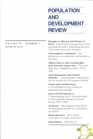 İÇİNDEKİLERARTICLESUnintended Consequences of US Immigration Policy: Explaining the Post-1965 Surge from Latin America douglas s. massey karen a. pren Son Preference, Sex Selection, and Kinship in Vietnam Christophe Z. Guilmoto The Latin American Cohabitation Boom, 1970-2007 Albert Esteve ron lesthaeghe antonio Löpez-Gay A Demographic Explanation for the Recent Rise in European Fertility John bongaarts tomâs sobotka NOTES AND COMMENTARY On the Crafting of Population Knovvledge susan greenhalgh DATA AND PERSPECTIVES Demographic Changes in North Korea: 1993-2008 thomas Spoorbnberg daniel Schwekendiei< ARCHIVES John Ramsay McCulloch on Population Growth as a Stimulus to Invention BOOK REVIEWS Ronald Lee and Andrew Mason, Population Aging and the Generational Economy: A Global Perspective GEOFFREY MCNICOLL Steven Pinker, The Better Angels of Our Nature: Why Violence Has Declined carl haub Mara Hvistendahl, Unnatııral Selection: Choosing Boys över Girls, and the Consequences of a World Full of Men Alaka Malvvade Basu Ralph Richard Banks, Is Marriagefor White People? How the African American Marriage Decline Affects Everyone tomas frejka Short Reviews Hovvard S. Friedman and Leslie R. Martin, The Longevity Project: Surprising Discoveries for Health and Long Life from the Landmark Eight-Decade Study Richard Heinberg, The End of Growth: Adapting to Our New Economic Reality Dagmar Herzog, Sexuality in Europe: A Twentieth-Century History Charles Teller and Assefa Hailemariam (eds.), The Demographic Transition and Development in Africa: The Unique Case of Ethiopia World Bank, World Development Report 2012: Gender Equality and Development D O CUMENTS Svviss Re on Understanding and Predicting Longevity ABSTRACTS AUTHORS FOR THIS ISSUE ![]() |