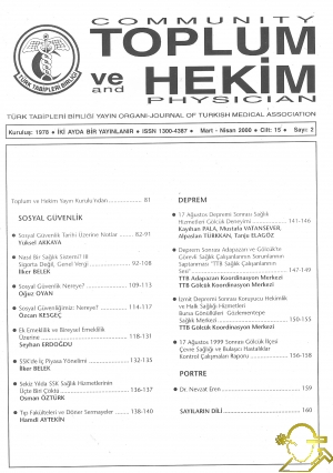 İÇİNDEKİLERToplum ve Hekim Yayın Kurulu'ndanSOSYAL GÜVENLİK • Sosyal Güvenlik Tarihi Üzerine Notlar Yüksel AKKAYA • Nasıl Bir Sağlık Sistemi? III Sigorta Değil, Genel Vergi İlker BELEK • Sosyal Güvenlik Nereye? Oğuz OYAN • Sosyal Güvenliğimiz: Nereye? Özcan KESGEÇ • Ek Emeklilik ve Bireysel Emeklilik Üzerine Seyhan ERDOĞDU • SSK'de İç Piyasa Yönelimi İlker BELEK • Sekiz Yılda SSK Sağlık Hizmetlerinin Üçte Biri Çöktü. Osman ÖZTÜRK • Tıp Fakülteleri ve Döner Sermayeler Hamdi AYTEKİN DEPREM • 17 Ağustos Depremi Sonrası Sağlık Hizmetleri Gölcük Deneyimi Kayıhan PALA, Mustafa VATANSEVER, Alpaslan TÜRKKAN, Tanju ELACÖZ • Deprem Sonrası Adapazarı ve Gölcük'te Görevli Sağlık Çalışanlarının Sorunlarının Saptanması "TTB Sağlık Çalışanlarının Sesi" TTB Adapazarı Koordinasyon Merkezi TTB Gölcük Koordinasyon Merkezi • izmit Depremi Sonrası Koruyucu Hekimlik ve Halk Sağlığı Hizmetleri Bursa Gönüllüleri Gözlementepe Sağlık Merkezi TTB Gölcük Koordinasyon Merkezi • 17 Ağustos 1999 Sonrası Gölcük İlçesi Çevre Sağlığı ve Bulaşıcı Hastalıklar Kontrol Çalışmaları Raporu PORTRE • Dr. Nevzat Eren SAYILARIN DİLİ ![]() |