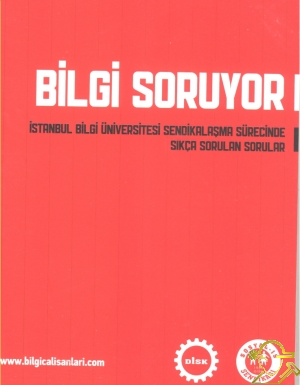 İÇİNDEKİLERGENEL SORULAR, SORUNLAR, KAYGILAR.NEDİR ŞU SENDİKA DEDİKLERİ? -Peki, ne işe yararlar? -Sendikalara, özellikle de Türkiye'dekilere hiç güvenim yok. Üye sayılarını ve aidatlarını arttırma peşindeler sadece. Diyelim ki sendikaya üye olduk, sendika bizim onayımız olmadan bizim adımıza tasarrufta bulunabilir mi? -Hakkımı mahkeme yoluyla bireysel olarak arayabiliyorsam neden sendikaya ihtiyaç duyayım .SENDİKAYA ÜYE OLMAK SUÇ MUDUR? -Peki, bu hakkın kullanılmasını engelleyenlere karşı somut bir yaptırım var mı? -Bütün bunlar iyi hoş da, sendika üyesi olursam işten çıkarılır mıyım? -Benim gözüm tazminatta değil. Sendika, işime devam edebilmem için başka ne yapabilir? .Sendika, üyelerine neler sağlar? -Peki, sendikalar bu beklentiyi karşılamak için ne yapar? .Kimler, hangi Sendikaya üye olabilir? -Bir vakıf üniversitesi çalışanı hangi sendikaya üye olabilir? Akademik personel işçi sendikasına üye olabilir mi? -Bir işyerinin hangi işkolunda yer aldığı nasıl tespit edilir? .SENDİKALAŞMA SÜRECİ NASIL İSLER? -Sendikaya nasıl üye olunur? •Hemen yarın sendikaya üye olmak istiyorum. Ne yapmalıyım? •Yarı zamanlı öğretim elemanları ya da çalışan öğrenciler sendika üyesi olabiliyormuş, doğru mu? •Ama sendikalı olursam, maaşımdan yüksek bir aidat kesilecekmiş, doğru mu? •Peki, aidatı nasıl ödeyeceğim? •Sendika topladığı bu aidatlarla ne yapıyor? •Toplanan aidatlarla sendikacılar sefa mı sürüyor? •Yarın öbür gün Bilgi Üniversitesi'nden ayrıldım, başka bir işyerinde çalışmaya başladım. Üyeliğim ve aidat ödeme yükümlülüğüm devam eder mi? •Peki, sendikaya üye olduktan sonra sendikadan kendi isteğimle ayrılabilecek miyim? -Bir sendikanın bir işyerinde toplu iş sözleşmesi imzalayabilmesi için gerekli şartlar nelerdir? -Toplu iş sözleşmesi imzalamaya yetkili sendika nasıl olunur? TOPLU İŞ SÖZLEŞMESİ NEDİR? -Toplu iş sözleşmesiyle neler düzenlenebilir? -Vakıf üniversiteleri bünyesinde ihtiyaç ve sıkıntıları birbirinden çok farklı birimler var. Toplu iş sözleşmesinde bütün bunlar nasıl düzenlenecek? -İşveren toplu iş sözleşmesine aykırı davranabilir mi? -Peki, toplu iş sözleşmesi taslağının oluşturulması aşamasında biz çalışanların söz hakkı olacak mı? - Toplu iş sözleşmesi çalışanlar lehine ve ekonomik olarak işveren aleyhine düzenlemeler içerecek gibi görünüyor, işveren TİS ile verdiklerini başka türlü kısmaya kalkmasın? .SOSYAL-İŞ SENDİKASI NEDİR? -Sosyal-İş bugün hangi işyerlerinde örgütlü? -Sosyal-İş'in temel ilkeleri nedir ve yapılanması nasıldır? İSTANBUL BİLGİ ÜNİVERSİTESİ'NE ÖZGÜ SORULAR, SORUNLAR, KAYGILAR .ÜNİVERSİTEDE SENDİKA OLUR MU? -Üniversitede sendika nasıl olacak? Burası şirket mi? Bir eğitim kurumunun işi kaliteli eğitim sağlamak değil mi, sendika huzuru bozmaz mı? -Türkiye'de ve dünyada üniversitelerde sendika diye bir şey var mı ki biz böyle bir işe kalkışıyoruz? -Bütün üniversite çalışanlarının aynı sendikada bir araya gelmesi doğru bir şey mi? Akademisyenlerin, idari personelin ve destek personelinin sorunları ve çıkarları çok farklı değil mi? Aynı TİS'te nasıl bir araya gelebilirler? -Bilgi'deki sendika biriminin örgütlenme şeması nasıl olacak? .AKADEMİK YAŞAM İLE SENDİKAL ÖRGÜTLENME BAĞDAŞIR MI? -Sendika üyeliğinin getireceği avantajlar ile akademik liyakat ölçütleri nasıl bağdaşacak? Akademik açıdan daha yetersiz birinin sırf sendika üyesi oldu diye akademik açıdan daha yeterli bir başkasının önüne haksızca geçmesine nasıl engel olunacak? -Ben başarılı bulunduğum için aynı akademik ünvana sahip meslekdaşlarımdan daha yüksek ücretle işe alınmıştım. Sendika üyesi olursam ve TİS yapılırsa, benimle aynı akademik ünvana sahip olanlarla aynı ücreti almak zorunda kalır mıyım? -İyi bir akademisyenin sendika üyesi olmanın getireceği güvenceye zaten ihtiyacı yoktur. Ben de iyi bir akademisyenim, sendikaya üye olmaya niye ihtiyacım olsun ki? -Sendikanın akademik özgürlükleri korumada nasıl bir rolü olabilir? -Ne yani greve gidersek mesela öğrencilerimizle ilgilenmeyecek miyiz? Hocalık ile sendika üyeliği nasıl bağdaşır? .BİLGİ'DE SENDİKA-NEDEN ŞİMDİ? -Derdimiz ne? Neden eski köye yeni adet getirmeye çalışıyoruz ki? -Sendika daha önce gerekli değil miydi? Neden yönetim değişikliği olduktan sonra gündeme geldi? Eski yönetim ve yeni yönetim tartışmalarında sendika bir araç olarak kullanılıyor olmasın? -Diyorlar ki 'eski yönetimin gözdeleri ayrıcalıklarını kaybedecekleri endişesiyle bu sendika işinde başı çekiyorlarmış'. Bunda bir gerçeklik payı var mı? . SENDİKA ÜYESİ OLURSAM / OLMAZSAM BİLGİ'DE BAŞIMA NE GELİR? -Bazı idari amirler teke tek görüşmelerde ve yaptıkları toplantılarda sendikalaşma konusunda ileri geri konuştular, neredeyse üye olmamamız için tehdit ettiler. Ben korktum doğrusu. Böyle bir şey yapmaya hakları var mı? Bu tür şeylere karşı sendika neler yaptı ya da yapabilir? -Siz işveren baskı yapıyor diyorsunuz ama sendika da üye kaydetmek için insanları zorluyormuş, bunu nasıl açıklarsınız? -Ben amirimi çok seviyorum, arkadaşım sayılır, çok emeği geçti. Kendisi amir pozisyonunda olduğu için sendikaya giremezmiş, girene de karışmam diyor ama ben şimdi üye olursam onu zor durumda bırakmış olmam mı? -Ben amirimi hiç sevmiyorum, üye olursam bana zararı dokunur mu? Bana angarya yüklerse? -Koskoca profesörü attılar ne yaptı sendika? -Herhangi bir sosyal sorumluluk projesine dahil isem, sendikaya üye olmam bu projeye üniversitenin verdiği desteğin çekilmesine yol açar mı? .İSTANBUL BİLGİ ÜNİVERSİTESİ SENDİKA BİRİMİ NEDİR? -Şu anda istanbul Bilgi Üniversitesi Sen