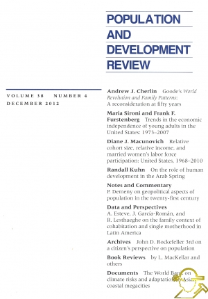 İÇİNDEKİLER3OPULATION.ARTICLES -Goode's World Revolution and Family Patterns: A Reconsideration at Fifty Years Andrew J. Cherlin -Trends in the Economic Independence of Young Adults In the United States: 1973-2007 Maria Sironi Frank F.Furstenberg -Relative Cohort Size, Relative Income, and Married Women's Labor Force Participation: United States, 1968-2010 Diane J.Macunovich -On the Role of Human Development in the Arab Spring Randall Kuhn .NOTES AND COMMENTARY -Geopolitical Aspects of Population in the Twenty-First Century Paul Demeny .DATA AND PERSPECTIVES -The Family Context of Cohabitation and Single Motherhood in Latin America Albert Esteve Joan GarcIa-Roman Ron Lesthaeghe .ARCHIVES -John D. Rockefeller 3rd on a Citizen's Perspective on Population .BOOK REVIEWS -Sylvester J. Schieber, The Predictable Surprise: The Unraveling of the U.S. Retirement System Landis MacKellar .Short Reviews -Brahma Chellaney, Water: Asia's New Battleground -Roderick Floud, Robert W. Fogel, Bernard Harris, and Sok Chul Hong, The Changing Body: Health, Nutrition, and Human Development in the Western World since 1700 -Becky Pettit, Invisible Men: Mass Incarceration and the Myth of Black Progress -Etienne Piguet, Antoine Pecoud, and Paul de Guchteneire (eds.), Migration and Climate Change -Thomas Robertson, The Malthusian Moment: Global Population Growth and the Birth of American Environmentalism -Jacob S. Siegel, The Demography and Epidemiology of Human Health and Aging -Paul D. Williams, War and Conflict in Africa .DOCUMENTS -The World Bank on Climate Risks and Adaptation in Asian Coastal Megacities .ABSTRACTS .AUTHORS FOR THIS ISSUE .ACKNOWLEDGMENTS ![]() |
