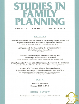 İÇİNDEKİLER.ARTICLES-The Effectivenes of Youth Centers in Increasing Use of Sexual and Reproductive Healt Services: A Systematic Rewiew Maria A.Zuurmond Rebecca S.Geary David A. Ross -A.Framework for Analyzing the Determinants of Obstetric L.Lewis Wall -Factors Associated with Abortion-Seeking and Obtaining a Safe Abortion in Ghana Fistula Formation Aparna Sundaram Fatima Juarez Akinrinola Bankole Susheela Singh -What Works to Prevent Child Marriage: A Review of the Evidence Susan Lee-Rife Anju Malhotra Ann Warner Allison McGonagle Glinski -Impact of Provider Job Aid Intervention on Injectable Contraceptive Continuation in South Africa Joy Noel Baumgartner Chelsea Morroni Regina Dlakulu Mlobeli Conrad Otterness Geoffrey Buga Mario Chen .DATA -Armenia 2010:Results from the Demographic and Healt Survey -Senegal 2010-11:Results from the Demographic and Healt Survey .BOOK REVIEW -Jenny Trinitapoli and Alexander Weinreb Religion and AIDS in Africa Jennifer Johnson-Hanks ![]() |