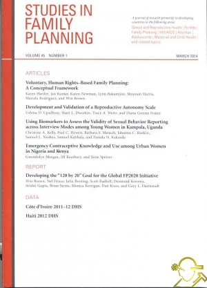 İÇİNDEKİLERARTICLESVoluntary, Human Rights-Based Family Planning: A Conceptual Framework ..........................................1 Karen Hardee, Ian Kumar, Karen Newman, Lynn Bakamjian, Shannon Harris,Mariela Rodrîguez, and Win Brown Development and Valıdatıon of a Reproductıve Autonomy Scale ........................19 Ushma D. U adh a , Shari L. Dworkin, Trac A. Weitz, and Diana Greene Foster Using Biomarkers to Assess the Validity of Sexual Behavior Reporting across Interview Modes among Young Women in Kampala, Uganda .........................43 Christine A. Kelly, Paul C. Hewett, Barbara S. Mensch, Johanna C. Rankin,Jther pric- Samuel L. Nsobya, Samuel Kalibala, and Pamela N. Kakande Emergency Contraceptive Knowledge and Use among Urban Women in Nigeria and Kenya ................59 Gwendolyn Morgan, Iill Keesbury, and Ilene Speizer REPORT Developing the “120 by 20" Goal for the Global FP2020 Initiative ......................................73 Win Brown, Nel Druce, Julia Bunting, Scott Radloff, Desmond Koroma,Srishti Gupta, Brian Siems, Monica Kerrigan, Dan Kress, and Gary L. Darmstadt ![]() |