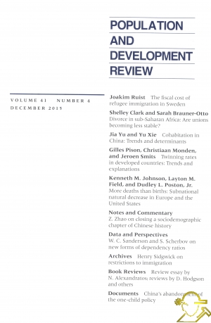 İÇİNDEKİLERThe Fiscal Cost of Refugee Immigration: The Example of Sweden 567JOAKIM RUIST Divorce in sub-Saharan Africa: Are Unions Becoming Less Stable? 583 SHELLLEY CLARK SARAH BRAUNER-OTTO Cohabitation in China: Trends and Determinants 607 JIA YU YU XIE Twinning Rates in Developed Countries: Trends and Explanations 629 GILLES PISON CHRISTIAAN MONDEN JERUEN SMITS More Deaths Than Births: Subnational Natural Decrease in Europe and the United States 651 KENNETH M. JOHNSON LAYTON M. FIELD DUDLEY L. POSTON JR. NOTES AND COMMENTARY Closing a Sociodemographic Chapter of Chinese History 681 ZHONGWEI ZHAO DATA AND PERSPECTIVES Are We Overly Dependent on Conventional Dependency Ratios? 687 WARREN C. SANDERSON SERGEI SCHERBOV ARCHIVES Henry Sidgwick on Restrictions to Immigration 709 BOOK REVIEWS Governments, Markets, and the Ending of Hunger: A Review Essay on C. Peter Timmer, FooD Security and Scarcity: Why Ending Hunger Is So Hard NIKOS ALEXANDRATOS 713 Piers J. Hale, Political Descent: Malthus, Mutualism, and the Politics of Evolution in Victorian England DENNIS HOTJGSON 721 Stefan Kühl, For the Betterment of the Race: The Rise and Fall of the International Movement for Eugenics and Racial Hygiene LANDIS MACKELLAR 725 Short Reviews 727 Paul Collier, Exodus: How Mİgration Is Chanqing Our World Koenraad Matthijs, Karel Neels, Christiane Timmerman Jacques Haers, and Sara Mels (eds.), Population Change in Europe, the Midle-East and North Africa: Beyond the Demographic Divide Akim J. Mturi and Samuel Agyei-Mensah (eds.), Explaning Fertility Differences in Sub-Saharan Africa: Projectig the Demographic Future National Academies of Sciences, Engineering, and Medicine, The Growming Gap in Life Expectancy by Income: Implications for federal Programs and Policy Responses Gernot Wagner and Martin L. Weitzman, Climate Shock: The Economic Consequences Of a Hotter Planet DOCUMENTS China's Abandonment of the One-Child Policy 733 ABSTRACTS 735 AUTHORS FOR THIS ISSUE 737 NOTLARVolume 41, Number 4, December 2015 ![]() |