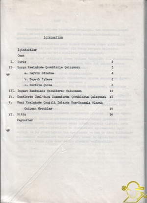 İÇİNDEKİLERİçindekilerÖzet I. Giriş II. Tarım Kesiminde Çocukların Çalışması a. Hayvan Otlatma b. Toprak İşleme c. Gurbete Çıkma III. İnşaat Kesiminde Çocukların Çalışması IV. Kentlerde Okul Dışı Zamanlarda Çocukların Çalışması V. Kent Kesiminde Çeşitli İşlerde Tam - Zamanlı Olarak Çalışan Çocuklar VI. Bitiş Kaynaklar ![]() |