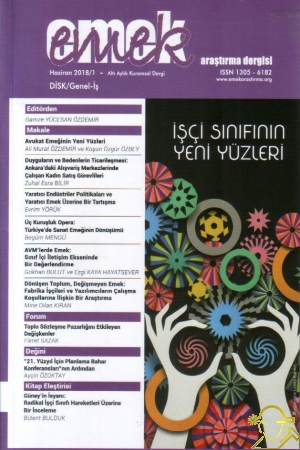 İÇİNDEKİLERİşçi Sınıfının Yeni YüzleriEditörden Gamze Yücesan Özdemir Makale Avukat Eğitiminin Yeni Yüzleri Ali Murat Özdemir ve Koşun Özgür Özbey Duygularının ve Bedeninin Ticarileşmesi: Ankara'daki Alışveriş Merkezlerinde Çalışan Kadın Satış Görevlileri Zuhal Esra Bilir Yaratıcı Endüstriler Politikaları ve Yaratıcı Emek Üzerine Bir Tartışma Evrim Yörük Üç Kuruşluk Opera: Türkiye'de Sanat Emeğinin Dönüşümü Begüm Mengü AVM'lerde Emek: Sınıf İçi İletişim Ekseninde Bir Değerlendirme Gökhan Bulut ve Ezgi Kaya Hayatsever Dönüşen Toplum, Değişmeyen Emek: Fabrika İşçileri ve Yazılımcıların Çalışma Koşullarına İlişkin Bir Araştırma Mine Dilan Kıran Forum Toplu Sözleşme PAzarlığını Etkileyen Değişkenler Fikret Sazak Değini "21. Yüzyıl İçin Planlama Bahar Konferansları"nın Ardından Ayçin Özoktay Kitap Eleştirisi Güney'in İsyanı: Radikal İşçi Sınıfı Hareketleri Üzerine Bir İnceleme Bülent Bulduk ![]() |