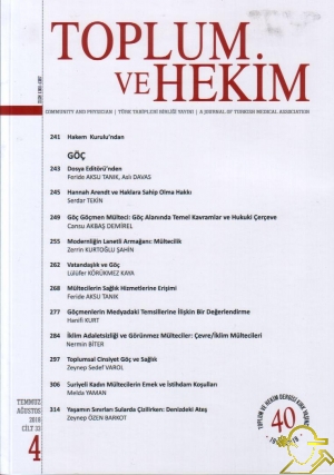İÇİNDEKİLERHakem Kurulu'ndanGÖÇ Dosya Editörü'nden Feride AKSU TANIK, Aslı DAVAS Hannah Arendt ve Haklara Sahip Olma Hakkı Serdar TEKİN Göç Göçmen Mülteci: Göç Alanında Temel Kavramlar ve Hukuki Çerçeve Cansu AKBAŞ DEMİREL Modernliğin Lanetli Armağanı: Mültecilik Zerrin KURTOĞLU ŞAHİN Vatandaşlık ve Göç Lülüfer KÖRÜKMEZ KAYA Mültecilerin Sağlık Hizmetlerine Erişimi Feride AKSU TANIK Göçmenlerin Medyadaki Temsillerine İlişkin Bir Değerlendirme Hanifi KURT İklim Adaletsizliği ve Görünmez Mülteciler: Çevre/İklim Mültecileri Nermin BİTER Toplumsal Cinsiyet Göç ve Sağlık Zeynep Sedef VAROL Suriyeli Kadın Mültecilerin Emek ve İstihdam Koşulları Melda YAMAN Yaşamın Sınırları Sularda Çizilirken: Denizdeki Ateş Zeynep ÖZEN BARKOT ![]() |