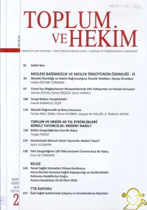 İÇİNDEKİLEREDİTÖR’DENEDİTÖR’DEN Dosya-Derleme MESLEKİ ÖZERKLİĞE VE HEKİM BAĞIMSIZLIĞINA YÖNELİK TEHDİTLER: DÜNYA ÖRNEKLERİ Türkmen, H.Ö. Dosya-Derleme CİNSEL SUÇ MAĞDURLARININ MUAYENELERİNDE ETİK YAKLAŞIMLAR VE HUKUKİ SONUÇLARI Altun, G.; Özçelik, Z.; Karaca, D. Dosya Gözlem ve Görüşler TERAPİ NOTLARI TERAPİSTİNDİR! Üçer, H.K. DOSYA/PANEL MESLEKİ BAĞIMSIZLIK VE BARIŞ SAVUNUSU Tanık, F.A.; Kloiber, O.; Haller, J.D.; Aktan, A.Ö. Bildiri KÜLTÜR DERGİCİLİĞİMİZE KISA BİR BAKIŞ Fişekçi, T. Bildiri “GÜNÜMÜZDE BİLİMSEL SÜRELİ YAYINCILIK: NEDEN? NASIL?” Uluşahin, A. Bildiri FİKİR DERGİCİLİĞİNİN 100 YILLIK SERÜVENİ ÜZERİNE KISA BİR BAKIŞ Türkmen, E.A. Belge TEMEL SAĞLIK HİZMETLERİ DÜNYA KONFERANSI ALMA-ATA’DAN EVRENSEL SAĞLIK KAPSAYICILIĞI VE SÜRDÜRÜLEBİLİR KALKINMA HEDEFLERİNE DOĞRU ASTANA KAZAKİSTAN 25-26 EKİM 2018 Öztek, Z. TTB Raporu ÖZEL SAĞLIK SEKTÖRÜNDE ÇALIŞMA VE ÜCRETLENDİRME BİÇİMLERİ ![]() |